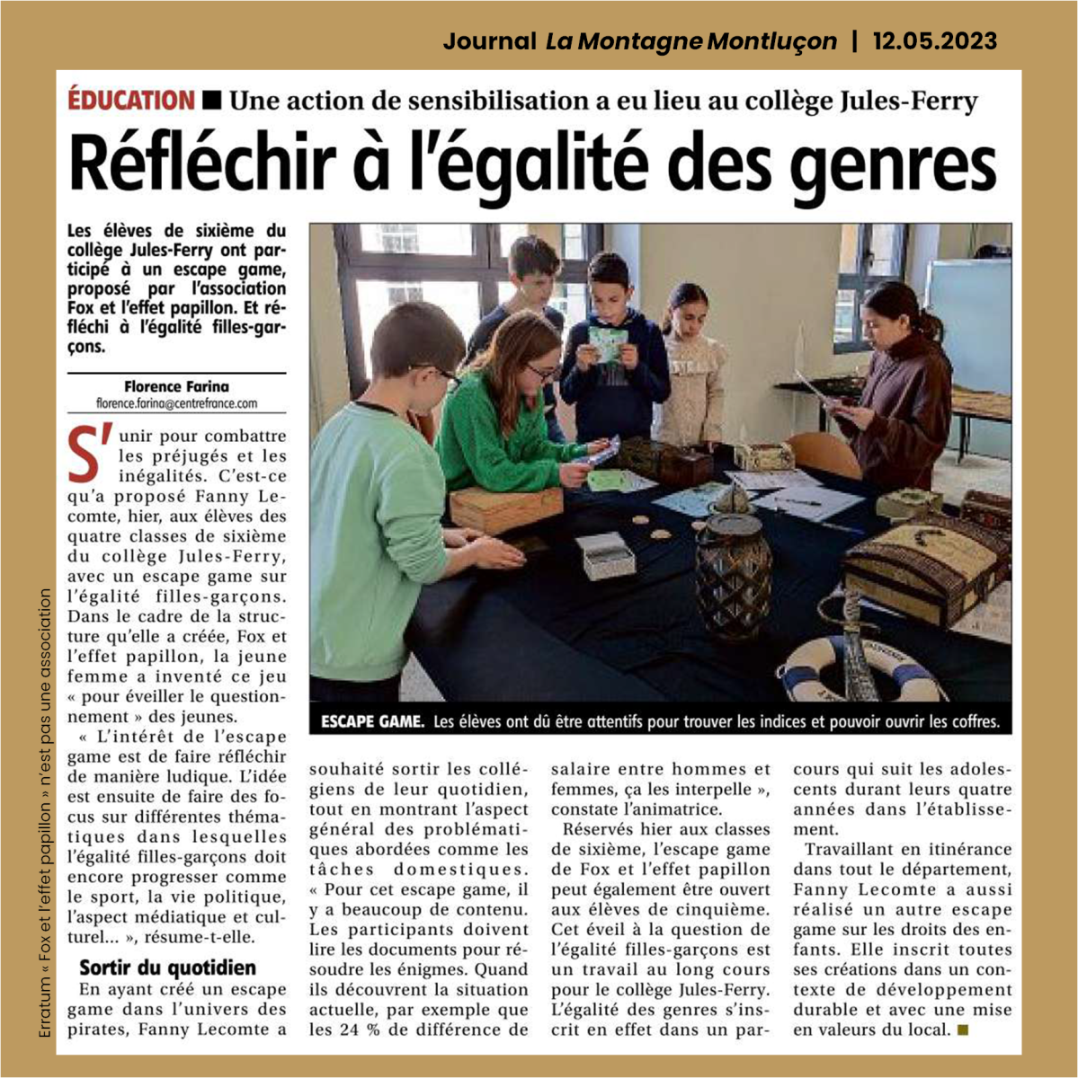 Cet escape game (jeu d’évasion grandeur nature) a été conçu à la demande du Conseil Départemental d’Accès aux Droit de l’Allier (CDAD 03) pour sensibiliser à l’égalité femmes-hommes.